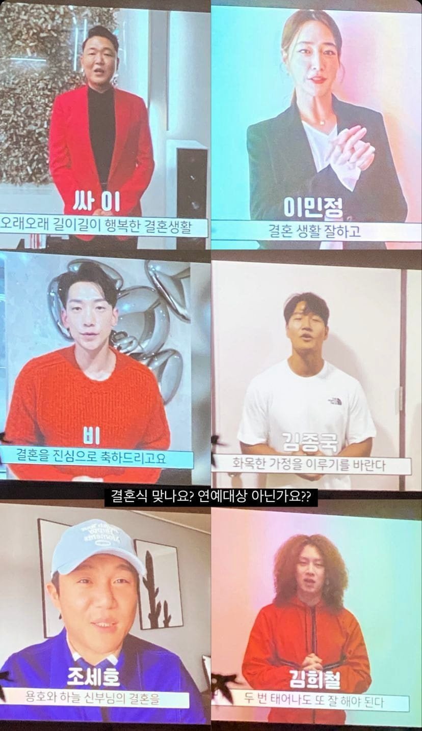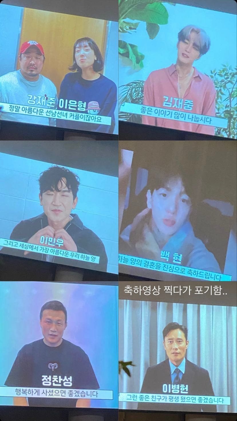 또 배우 이병헌, 이제훈, 이진욱, 홍석천, 지현우, 이민정, 가수 싸이, 슈퍼주니어, 비, 다이나믹 듀오, 크러쉬, 김재중, 이민우, 백현, 박재범, 송민호 등 톱스타들이 결혼 축하 영상을 보내기도 했습니다.
