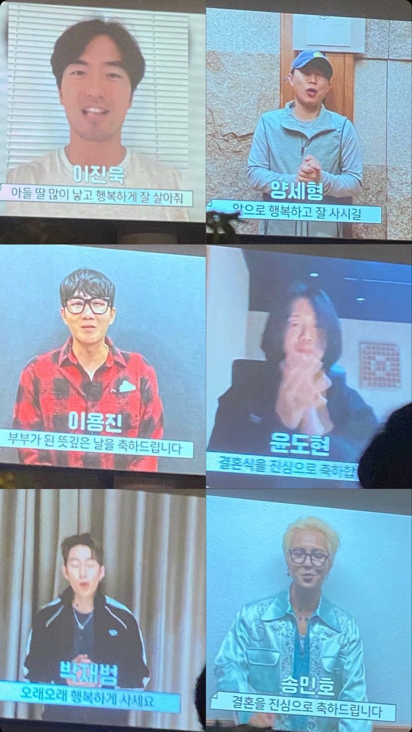 또 배우 이병헌, 이제훈, 이진욱, 홍석천, 지현우, 이민정, 가수 싸이, 슈퍼주니어, 비, 다이나믹 듀오, 크러쉬, 김재중, 이민우, 백현, 박재범, 송민호 등 톱스타들이 결혼 축하 영상을 보내기도 했습니다.
