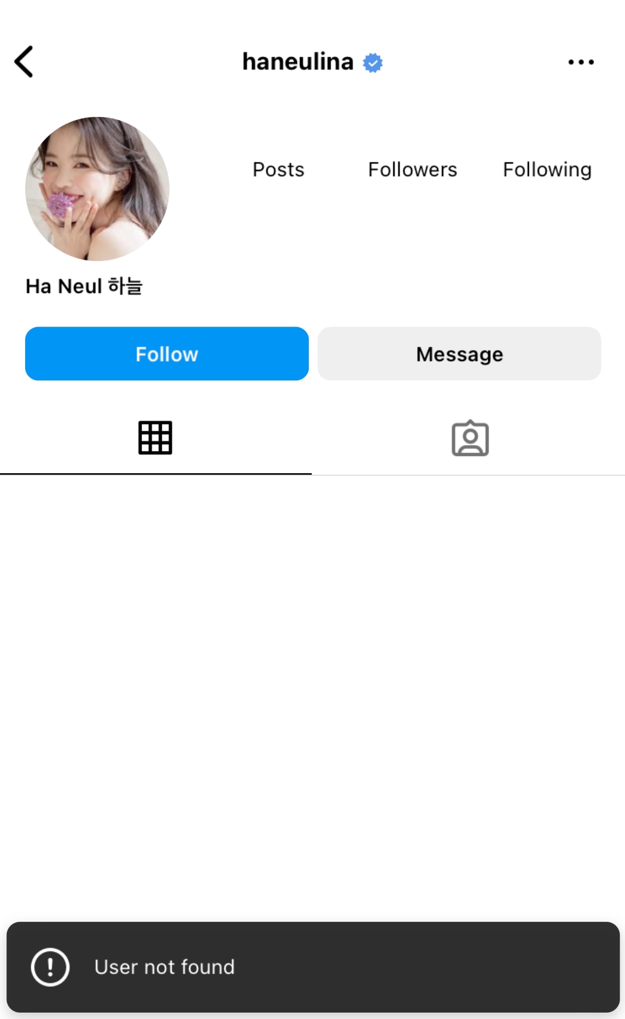 글과 함께 하늘의 SNS 계정으로부터 차단당해 'User not found'(사용자를 찾을 수 없음)이라는 알림이 뜬 화면도 함께 캡처해 올렸습니다.