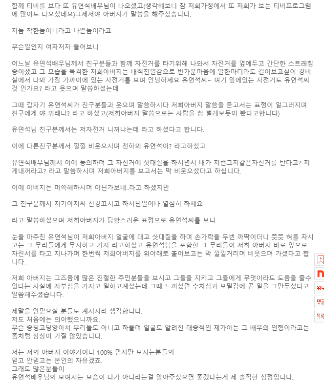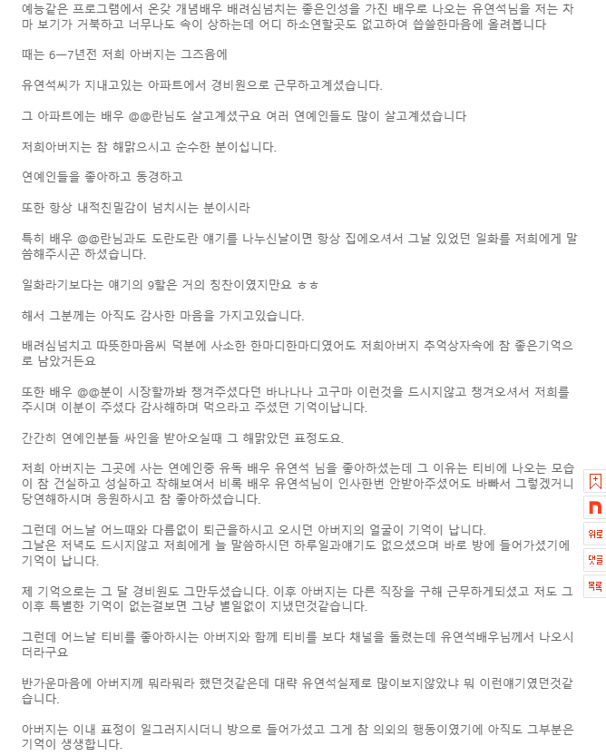 앞서 한 누리꾼 A씨는 "배우 유연석이 경비원이었던 우리 아버지를 무시했다"며 그의 인성에 대해 폭로하는 글을 써 논란이 되었습니다.