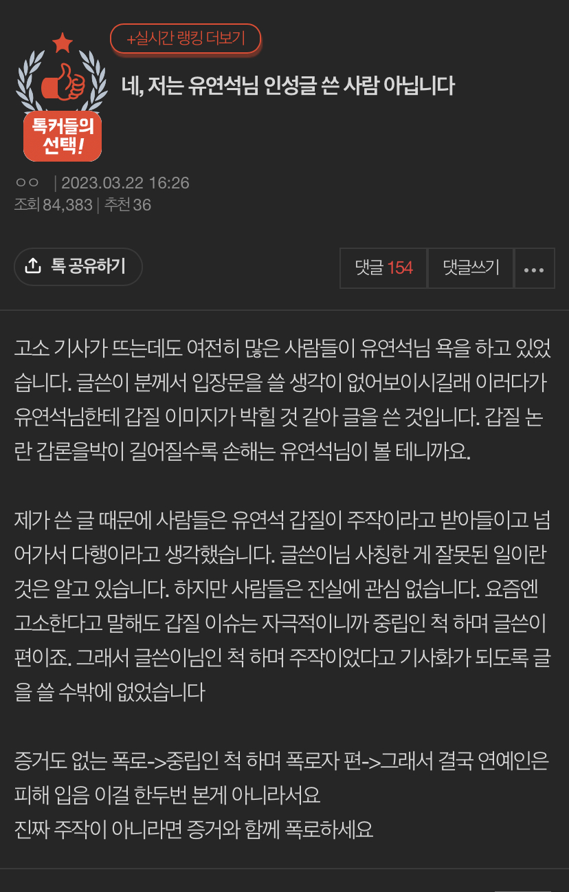 그러나 이후 다시 등장한 A씨가 "글쓴이라는 분이 질투심에 글을 올렸다 주작이다 사과하셨다는데 유연석 팬분이신지 누군지는 모르겠으나 사과글은 내가 쓴 게 아니다"며 B씨의 글과 무관함을 전했습니다.