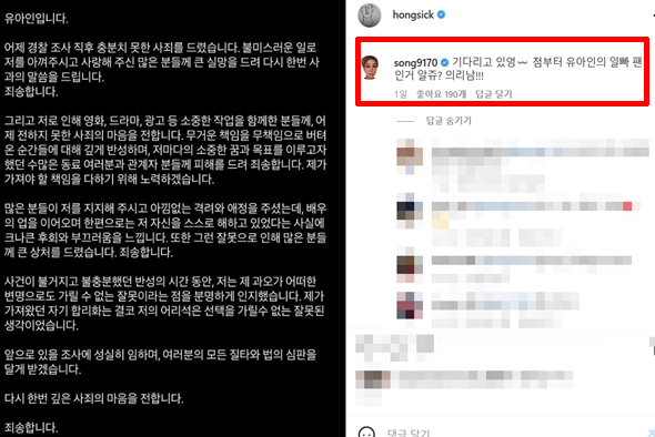 김송 마약 유아인 인스타 사과문 응원 댓글 논란