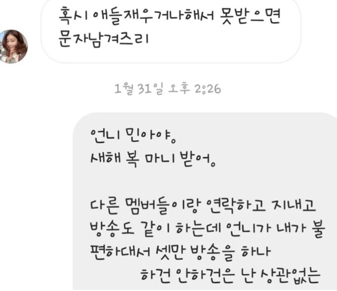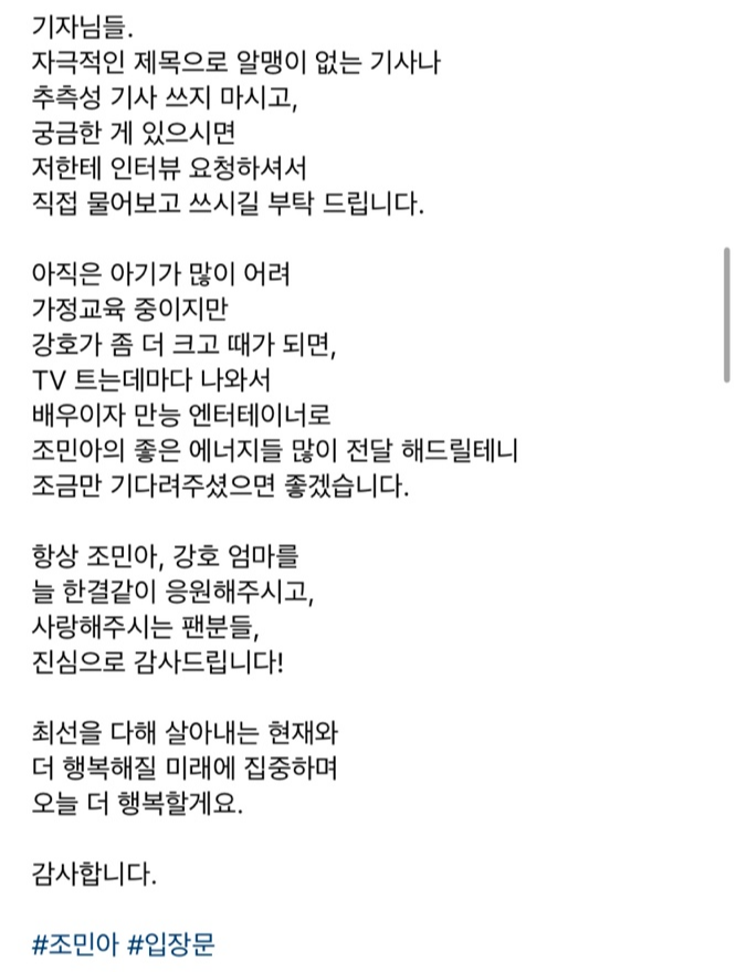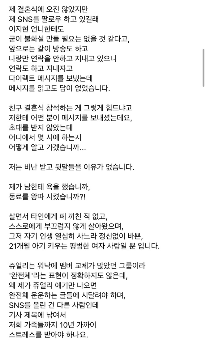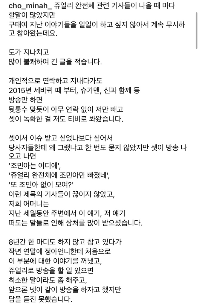 또 "셋이서 이슈받고 싶었나보다 싶어서 당사자들한테 왜 그랬냐고 한 번도 묻지 않았지만 '조민아는 어디에' '쥬얼리 완전체에 조민아만 빠졌네' '또 조민아 없이 모여?' 이런 제목의 기사들이 끊이지 않았다"라고 설명했습니다.