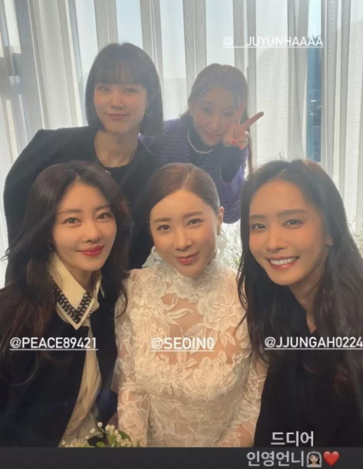 전날 서인영은 비연예인 사업가와 결혼식을 올렸습니다. 공개된 결혼식 현장 사진에는 쥬얼리 출신 박정아 이지현 하주연 은정이 모습을 드러냈지만 조민아의 모습은 보이지 않아 쥬얼리 불화설이 불거졌습니다.