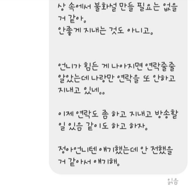 이어 "제 결혼식에 오지 않았지만 제 SNS를 팔로우하고 있길래 이지현 언니한테도 불화설 만들 필요는 없을 것 같다고 앞으로 같이 방송도 하고 연락도 하고 지내자고 다이렉트 메시지를 보냈는데 메시지를 읽고도 답이 없었다"고 아쉬움을 드러냈습니다.
