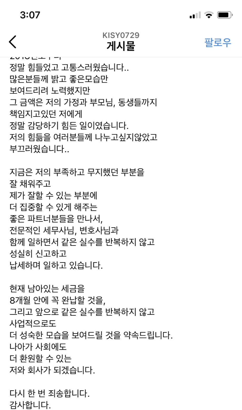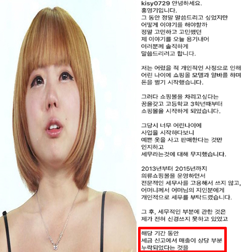 홍영기는 11일 자신의 인스타그램을 통해 쇼핑몰 운영과 관련, 과거 현금 매출 등에 대한 신고 누락으로 세금 체납이 발생했다고 고백했습니다.