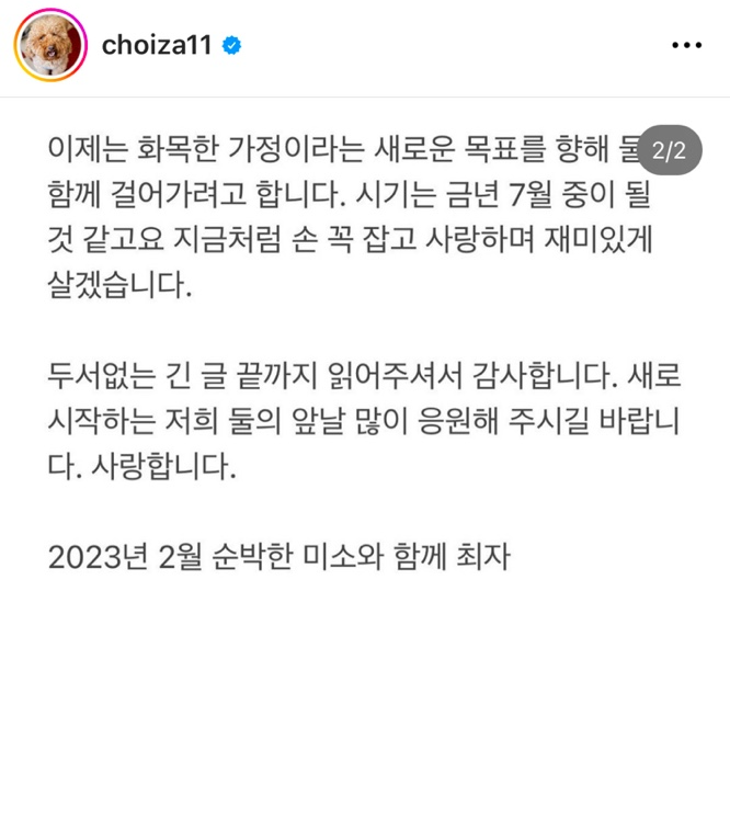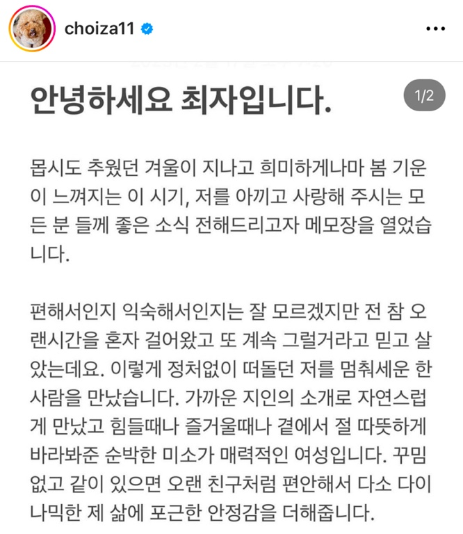 최자가 자신의 인스타그램에 결혼 소식을 알리는 장문의 글을 게재했습니다.