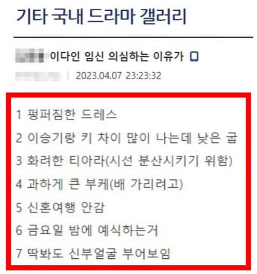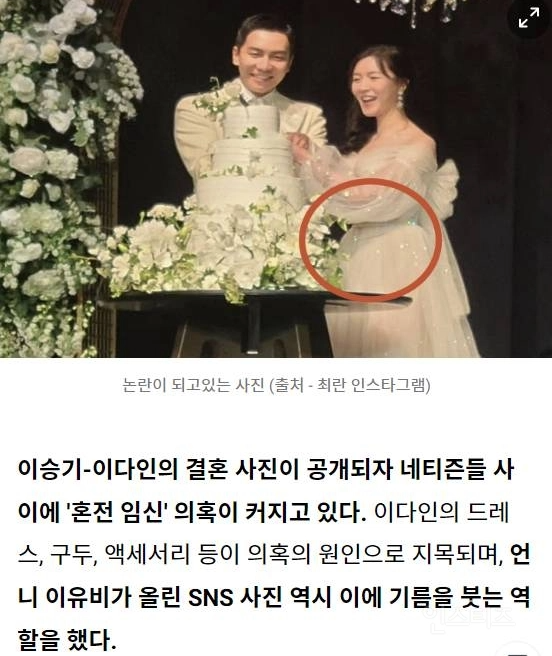 한 네티즌은 "(이다인이) 펑퍼짐한 드레스를 입고 이승기랑 키 차이가 크게 나는데도 낮은 굽의 구두를 신었다"며 "시선을 분산하고 배를 가리기 위해 화려한 티아라를 쓰고 과하게 큰 부케를 든 것 같다"고 주장했습니다.
