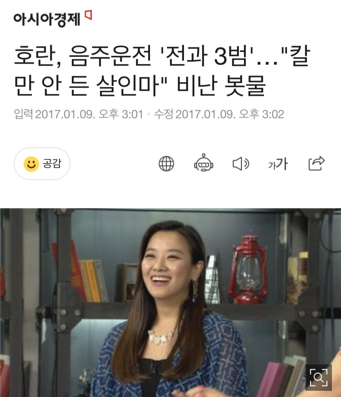 또 2016년에는 음주 상태로 성수대교 남단 인근을 지나가 3차선 도로 길가에 정차된 성동구청 청소 차량을 들이받기도 했습니다. 당시 운전석에 타고 있던 환경미화원은 전치 2주의 상해를 입었고 호란은 교통사고처리 특례법·도로교통법 위반 혐의로 벌금 700만 원 약식 기소 처분을 받았습니다.