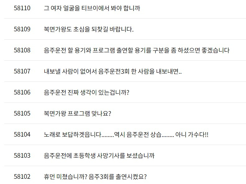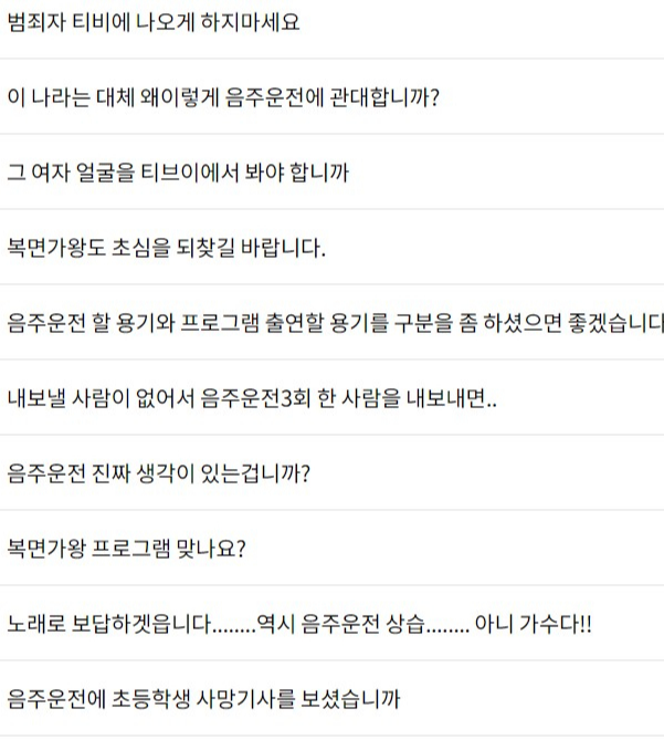 방송 직후 '복면가왕' 세청자 게시판에는 호란을 출연시킨 MBC를 향한 질타의 글이 쏟아졌습니다. 앞서 호란이 2004년, 2007년, 2016년 총 3번의 음주운전으로 적발됐기 때문입니다.