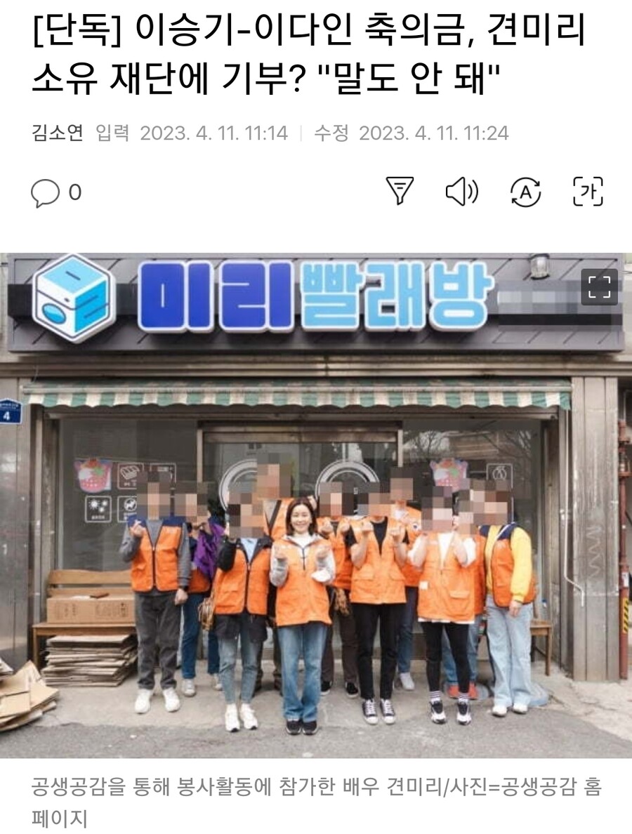 하지만 일각에서는 견미리가 자신이 소유한 재단에 기부하는 것이 아니냐는 의혹을 제기했습니다. 재단의 후원회장이 견미리 부부이고, 재단이 저소득층과 장애인을 위해 운영하는 가게의 상호명도 '미리빨래방'과 '미리나눔터'였기 때문입니다.