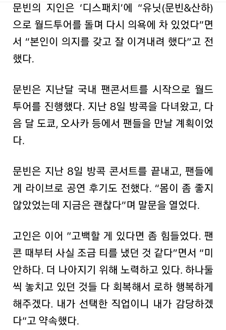 방콕 공연을 마친 뒤 문빈은 "좀 힘들었다. 조금 티가 났던 것 같아 미안하다. 나아지기 위해 노력하고 있다"고 밝히기도 했습니다. 그러나 결국 세상을 등지며 안타까움을 안겼습니다.