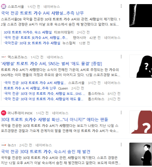 한 매체는 "여가수 A씨(30)가 숙소에서 숨진 채 발견이 됐다"고 보도했습니다. 이어 "트로트 장르 가수로 활동해 온 A씨는 대학에서 국악을 전공한 재원으로 판소리를 기반으로 한 가창력으로 주목을 받았다"고 덧붙였습니다.