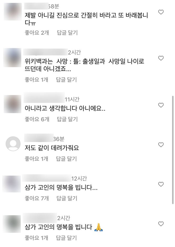 현재 해수의 인스타그램과 팬카페에는 "삼가 고인의 명복을 빕니다"라는 글이 차례로 올라왔습니다. 해수의 지인으로 보이는 이들도 "해수야 너 아니지? 답글 달아줘 카톡 주거나"라는 댓글을 달았지만 해수는 아무런 댓글도 남기지 않은 것으로 확인되고 있습니다.
