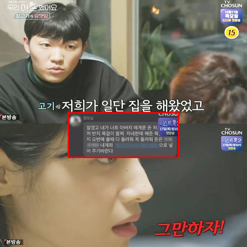 최고기는 패물에 대해 자금이 급할 때 팔았다고 털어놓았는데요, 이에 유깻잎 엄마는 "장가 올 때 내가 다이아를 박아서 주지 않았냐. 그거까지 팔아치우면 어쩌자는 거냐"라고 말했습니다.