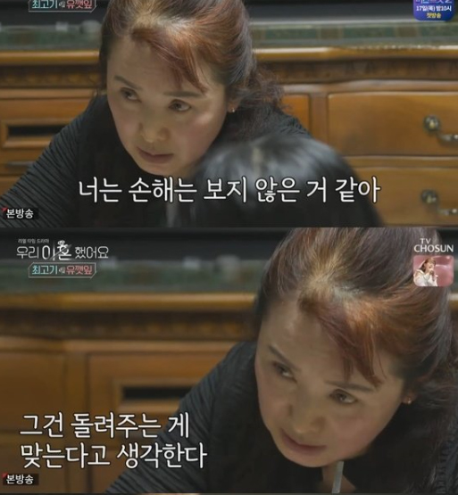 하지만 유깻잎 엄마는 "난 그거 갚느라 1년 동안 고생했다"라며 "대출 받아서 1천만 원 해간 거다. 결혼식 부조금으로 일부는 좀 갚고, 나머지는 고생해서 다 갚았다"라고 했습니다. 또 "패물은 다 내가 해준 거 아니냐. 내가 너한테 무리한 걸 요구하냐. 무리는 아닌 것 같다"라고 덧붙였습니다.