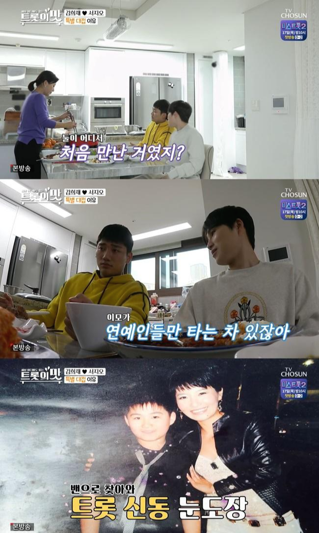 이후 서지오의 아들이 집에 돌아왔고 서지오, 김희재, 서지오 아들 세 사람은 식사를 했고, 서지오의 아들은 김희재에게 "사람들은 희재 형이 엄마 아들인 줄 안다. 둘이 어디서 처음 만났지?"라고 질문했고, 김희재는 "'유랑극단'이라는 노래자랑 프로그램을 했는데, 엄마(서지오)가 초대가수였다"며 "그때 형이 그 노래자랑에 참가했다"고 인연을 소개했습니다.