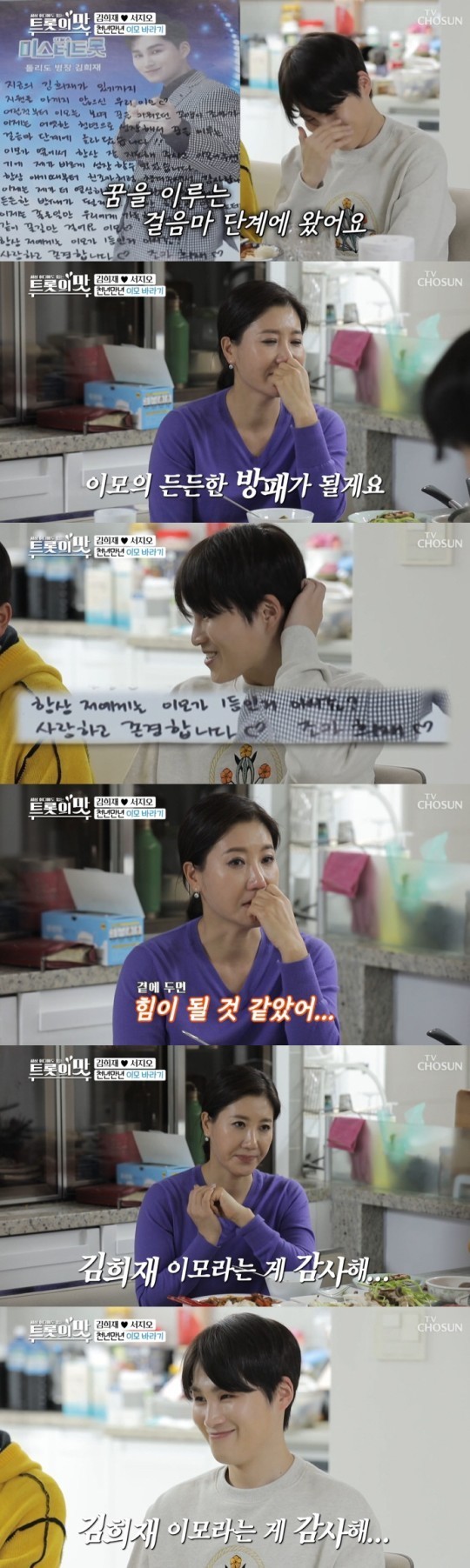 서지오는 공개된 편지에 눈물을 보였습니다. 서지오는 "저 편지가 힘이 됐다"며 "나이도 50이고, 그렇다고 대단한 히트곡을 만든 사람도 아니고. 내가 힘들 때 '희재가 이렇게 됐구나. 내가 더 꿋꿋하게 해야겠다'라는 생각이 들게 해줬다"고 고움을 드러냈습니다. 그러면서 "내가 '김희재 이모'라는 말을 듣는 게 너무 감사하다"고 말해 뭉클하게 했습니다.
