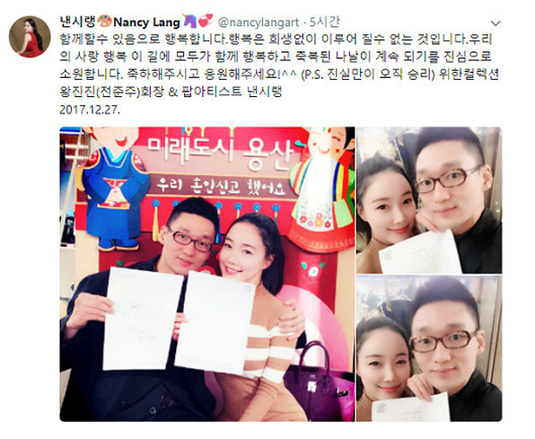 2017년 12월 27일 낸시랭이 결혼을 발표했습니다. 상대는 위한컬렉션 회장인 왕진진이었는데요, 당시 왕진진을 둘러싼 수많은 의혹이 있었으나, 두 사람은 기자회견을 열며 결백과 사랑을 강조했습니다.