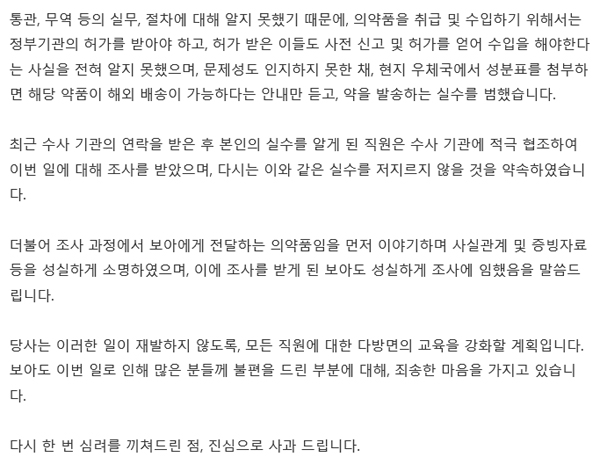 보아가 이와 관련으로 17일 검찰 조사를 받았다는것이 알려지자, SM은 17일 공식입장을 통해 "해외지사의 직원이 정식 수입통관 절차 없이 의약품을 우편물로 배송한 것이 사실"이라면서 "불법적으로 반입하려던 것이 아닌, 무역·통관 등에 지식이 없던 당사 해외지사 직원의 실수"라고 해명했습니다.