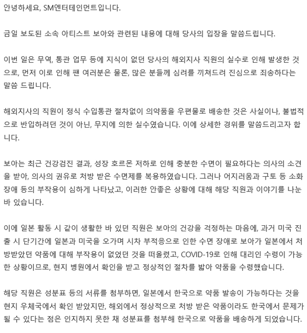 SM은 "이러한 안좋은 상황에 대해 해당 직원과 이야기를 나눈 바 있다"면서 해당 직원이 보아가 과거 일본에서 처방받은 약품이 부작용이 없던 것을 떠올려 대리 수령을 했다고 설명했습니다.