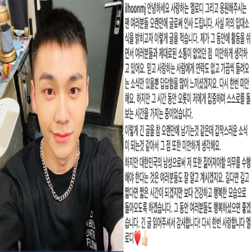 정일훈은 "대한민국의 남성으로 저 또한 짊어져야 할 의무를 수행해야 한다는 것은 여러분들도 잘 알고 계시겠지요"라며 "길다면 길고 짧다면 짧은 시간이 되겠지만 보다 건강하고 행복한 모습으로 돌아오도록 하겠다"고 전했습니다.