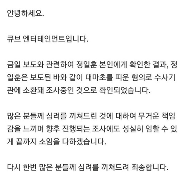 정일훈 소속사 측도 입장을 밝혔습니다. 정일훈의 소속사 큐브엔터테인먼트는 "정일훈 본인에게 확인한 결과, 정일훈은 보도된 바와 같이 대마초를 피운 혐의로 수사기관에 소환돼 조사 중인 것으로 확인됐다"라고 밝혔습니다. 이어 "많은 분께 심려를 끼쳐드린 것에 대하여 무거운 책임감을 느끼며 향후 진행되는 조사에도 성실히 임할 수 있게 끝까지 소임을 다하겠다"라고 강조했습니다.