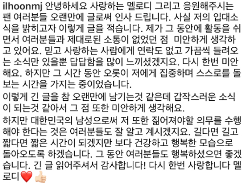 정일훈은 "대한민국의 남성으로 저 또한 짊어져야 할 의무를 수행해야 한다는 것은 여러분들도 잘 알고 계시겠지요"라며 "길다면 길고 짧다면 짧은 시간이 되겠지만 보다 건강하고 행복한 모습으로 돌아오도록 하겠다"고 전했습니다.