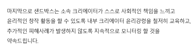 샌드박스는 "소속 크리에이터가 스스로 사회적인 책임을 느끼고 윤리적인 창작 활동을 할수 있도록 내부 크리에이터 윤리강령을 철저히 교육하고, 추가적인 피해 사례가 발생하지 않도록 지속해서 모니터링하겠다"라고 덧붙였습니다.
