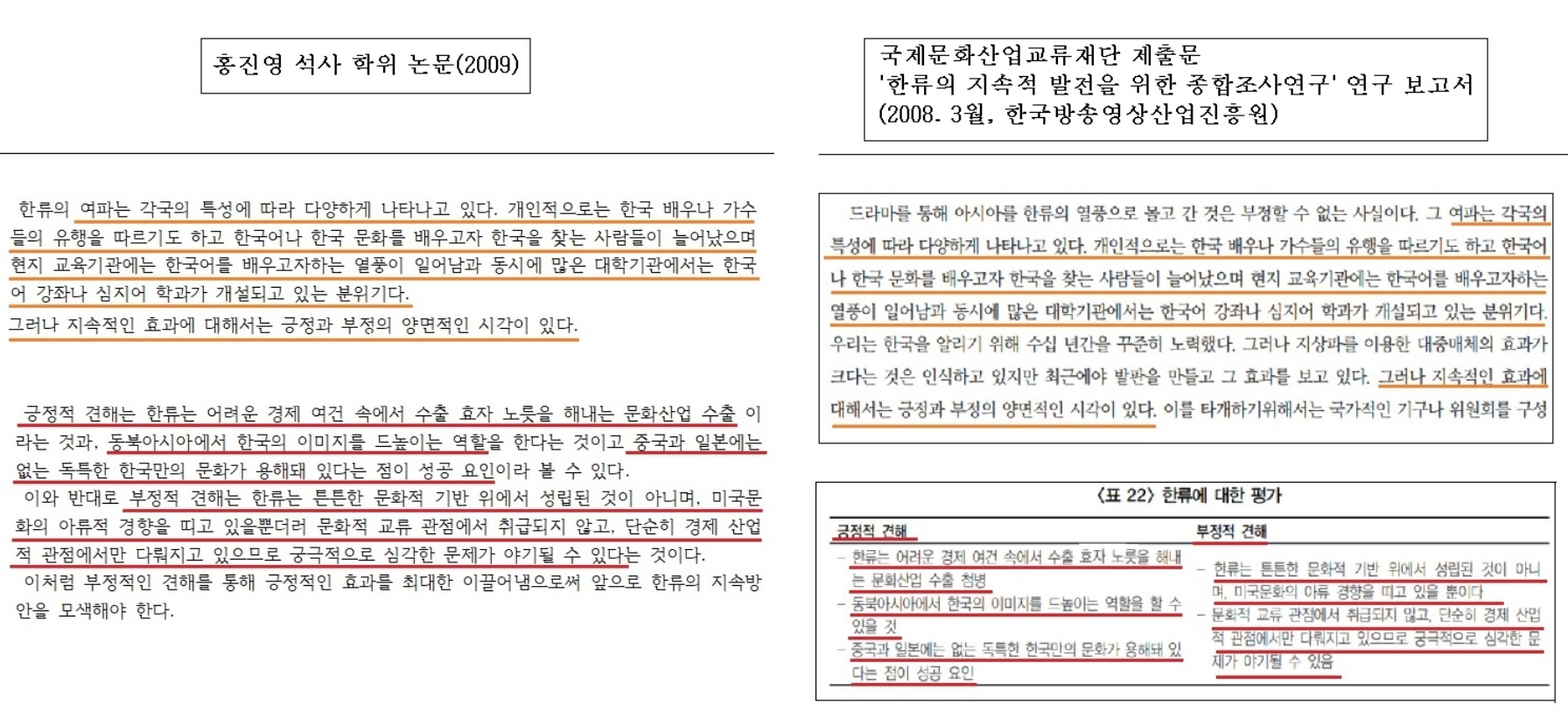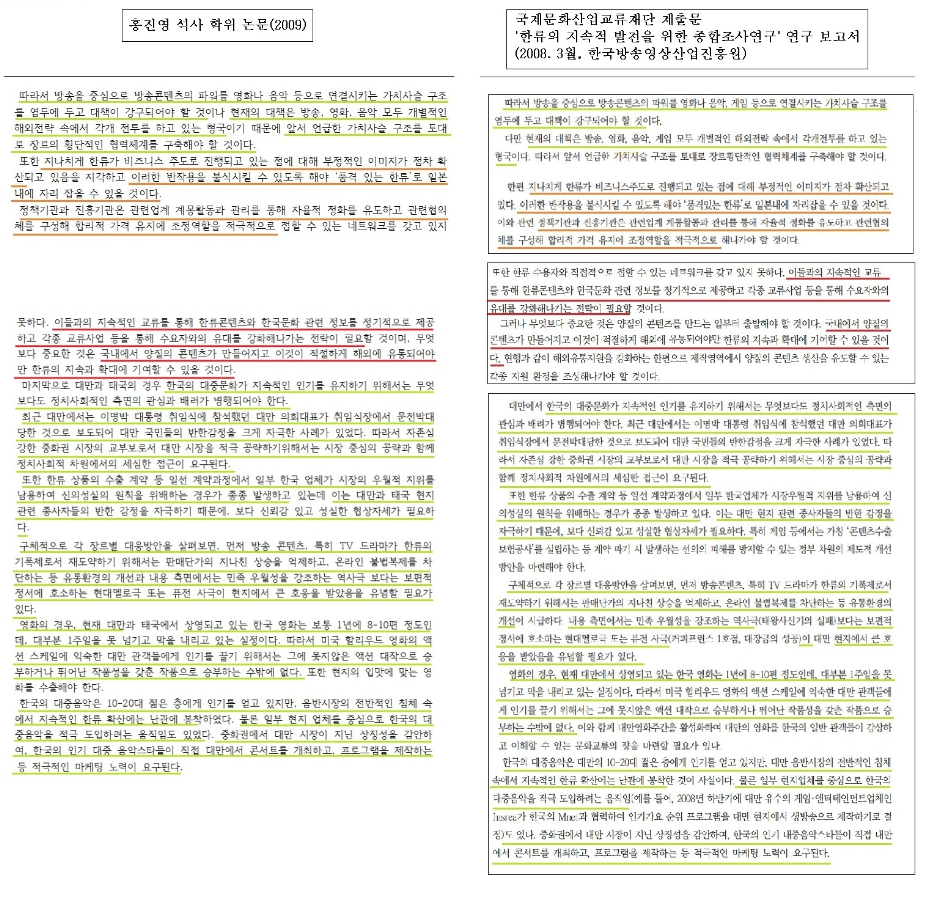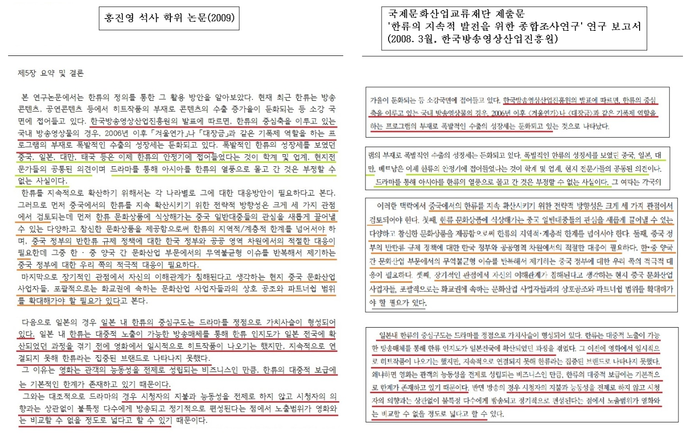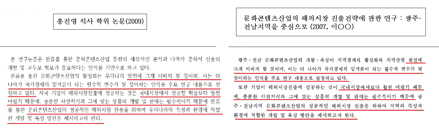 제보자 B 씨의 주장에 따라 논문을 살펴보면 2009년 홍진영이 석사 학위를 딴 논문의 '2. 연구의 목적'은 2년 전 (2007년) 같은 학교인 조선대학교 대학원에 재학 중인 대학원생 A 씨의 논문의 특정부분과 흡사한데요, A씨가 '지역경제 활성화와 지역산업 발전'을 목적으로 삼았다면, 홍진영의 논문은 '한류를 통한 문화콘텐츠 산업의 활성화'를 목적으로 하고 있습니다.
