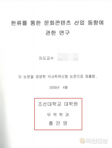 조선대학교가 가수 홍진영이 낸 석사 논문에 대해 '표절'로 잠정 결론을 내렸습니다. <홍진영 석사 논문 표절 논란> 2020년 11월, 전국 단위 일간지이자 언론사인 국민일보에서 홍진영이 2009년에