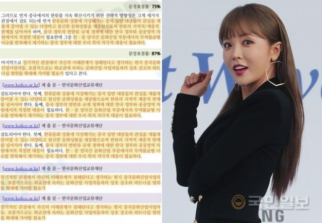홍진영의 논문 표절 의혹을 제기한 제보자 B 씨는 "민간 기관 (카피킬러)에 해당 논문의 표절 검사를 의뢰한 결과, 표절률은 74%로 분석됐다"라고 주장했습니다.