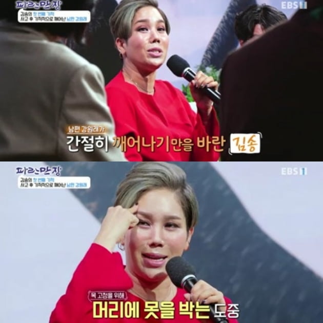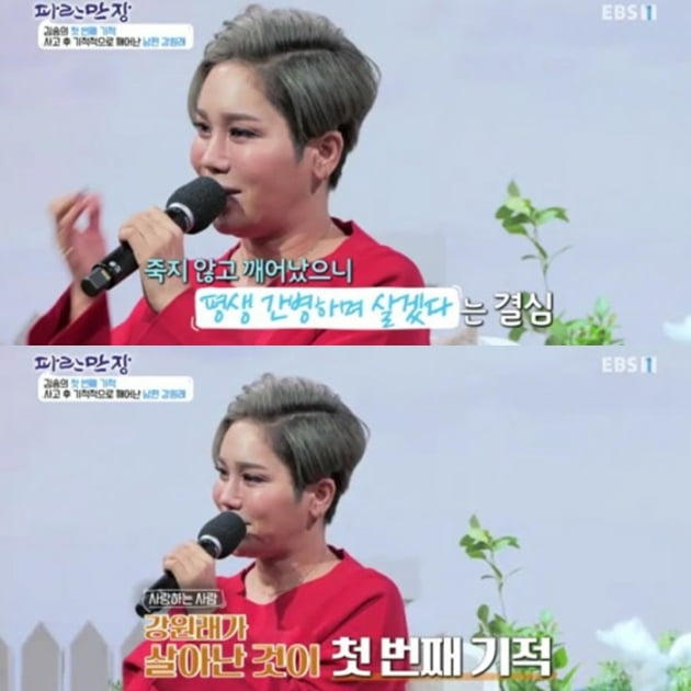 EBS '인생이야기 파란만장'에 김송이 출연했는데요, 김송은 세 가지 기적에 대해 얘기했습니다. 김송 인생에서 첫 번째 기적은 강원래가 교통사고 후 살아난 것이라 전했는데요, 김송은 "강원래 김송 10년 열애 곧 결혼 임박' 기사가 나고 뛸뜻이 기뻤다"고 전했습니다. 하지만 강원래가 교통사고를 당해 3개월 만에 그 행복이 깨졌습니다. 김송은 "병원에서 한 달 반 동안 의식 없이 헛소리를 할 때마다 '깨어만 났으면 좋겠다'라고 생각했다"며 이어 김송은 "목뼈 3개가 부러졌는데, 목 고정을 위해 머리에 못을 박았다. 얼마나 아팠으면 그때 정신이 돌아왔다. 나를 알아보고, 가족을 알아보더라. '원래 오빠 옆에서 평생 간병하면서 살 수 있어'라고 자신했었다. 나의 바람이 이루어진 첫 번째 기적이다"고 김송은 전했습니다.
