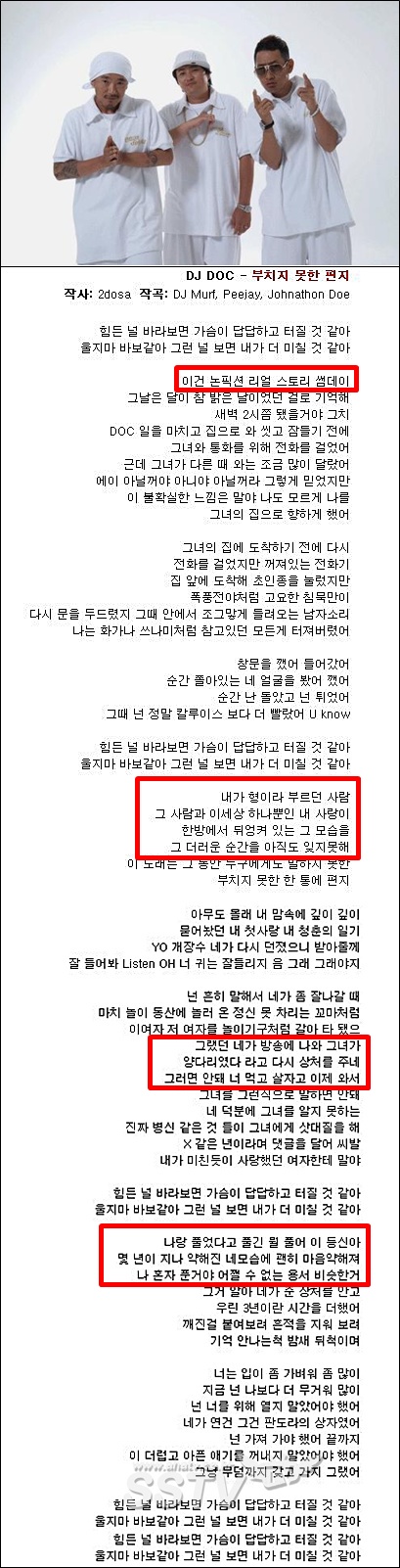 DJ DOC 노래 중 유명한 곡이죠. 부치지 못한 편지는 강원래의 디스곡이라고 하네요.