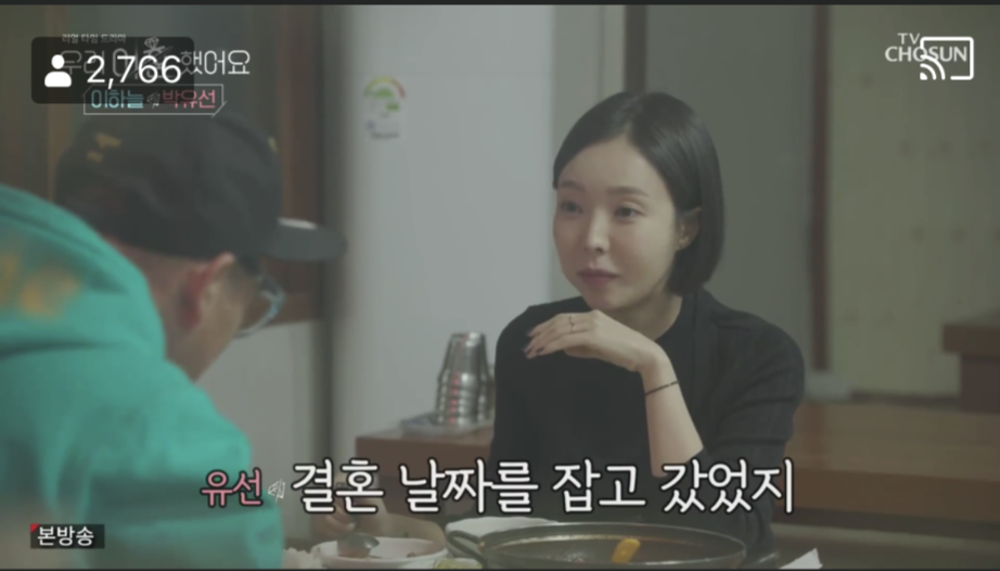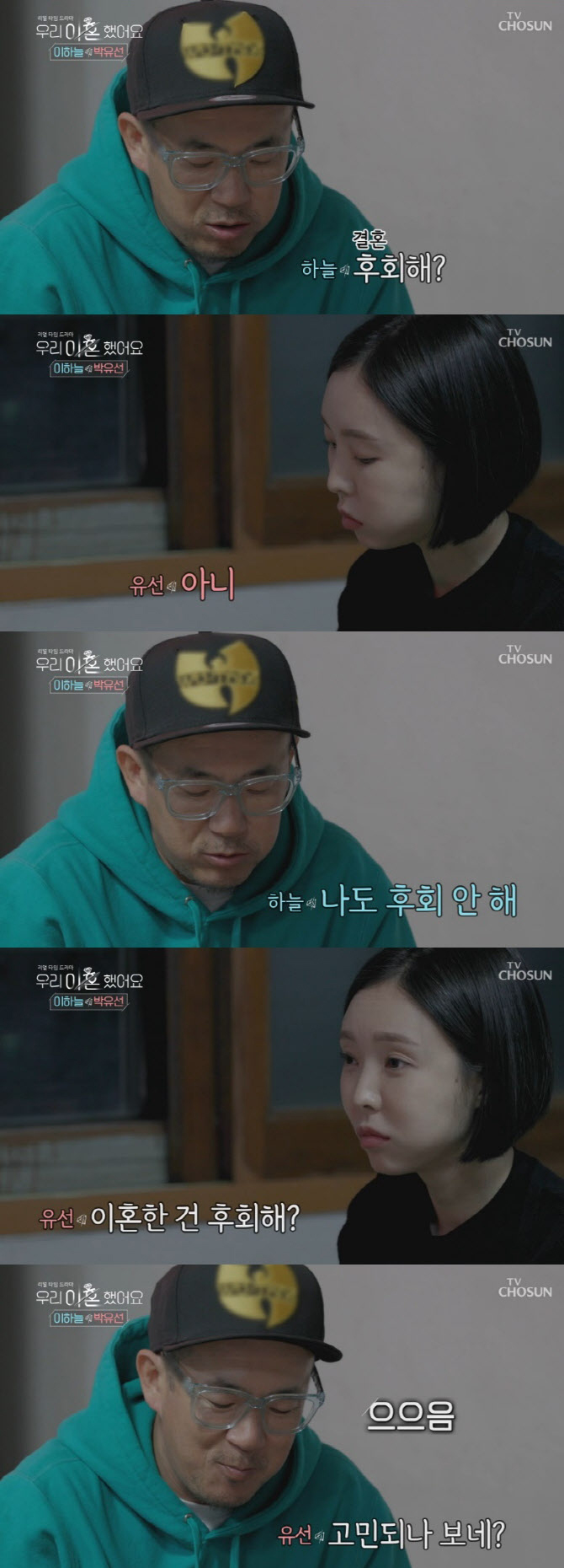 이하늘은 "결혼한 거 후회하냐"라고 물었고, 박유선은 "아니"라고 단호하게 답했습니다. 이어 박유선은 "이혼한 건 후회하냐"라고 재차 질문했고 이하늘은 대답하지 못하고 침묵했습니다. 이하늘은 "카메라 앞에서 밥 먹으면서 할 이야기는 아닌 것 같다"라며 대답했습니다.