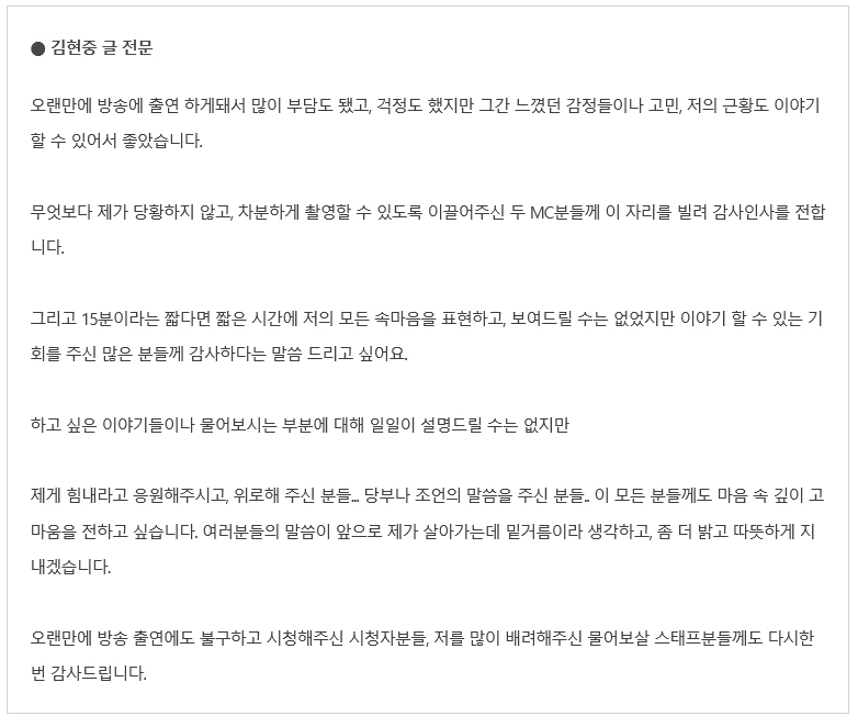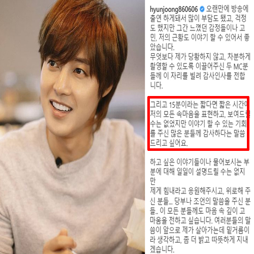 김현중은 5일 자신의 인스타그램에 "오랜만에 방송에 출연하게 돼서 많이 부담도 됐고, 걱정도 했지만 그간 느꼈던 감정들이나 고민, 저의 근황도 이야기할 수 있어서 좋았다'라고 시작하는 장문의 글을 게재했습니다. 이어 김현중은 "15분이라는 짧은 시간에 저의 모든 속마음을 표현하고 보여드릴 수는 없었지만 이야기할 수 있는 기회를 주신 많은 분들께 감사하다는 말씀드리고 싶다"고 적었습니다.