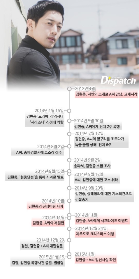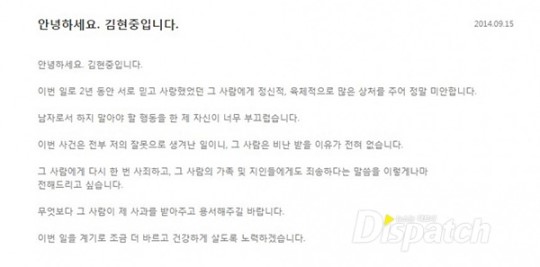 (2014년 9월 15일) : 김현중이 '현중닷컴'을 통해 사과문을 발표합니다. "2년을 믿고 사랑했던 사람에게 정신적, 육체적 상처를 줘 미안하다"고 공식 사과합니다.