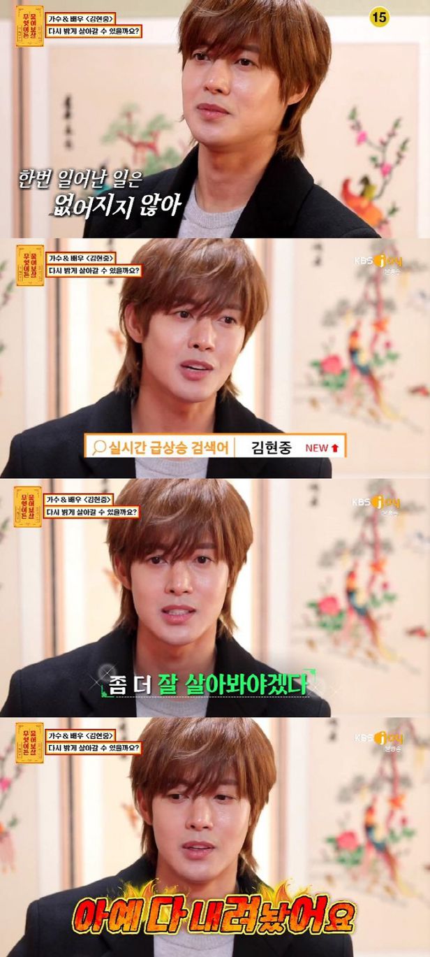 김현중은 '무엇이든 물어보살'에 출연해 "사람들의 시선이 신경 쓰인다. 나는 밝은 사람인데 점점 위축된다. 내 자신이 피해가 되는 사람이라는 생각이 들었다. 밝게 살아가고 싶다"는 고민을 털어놓았습니다.
