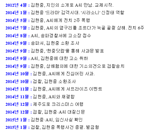 2. 폭행 (2014년 5월 30일, 7월 12일) : 김현중이 연인 A 씨를 폭행했습니다. A 씨는 전치 2주의 상해를 입었고, 7월에는 늑골이 골절되는 상해를 입었습니다. 전치 6주였습니다.