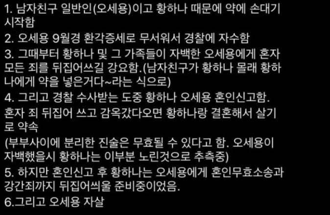 황하나의 남편 오 씨는 극단적인 선택을 하기 전 경찰을 찾은 것으로 알려졌는데요, 애초 "황하나 잘 때 몰래 투약했다"라고 전했던 진술을 뒤집고 "황하나와 함께 투약했다"라고 밝혔고 이틀 뒤 극단적인 선택을 한 것으로 알려졌습니다.