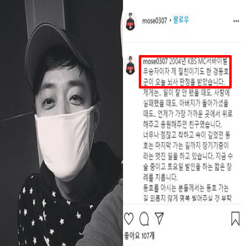 경동호와 절친한 친구인 가수 모세도 이날 자신의 인스타그램을 통해 "2004년 KBS MC 서바이벌 우승자이자 제 절친이기도 한 경동호 군이 오늘 뇌사 판정을 받았다"라고 비보를 알렸습니다.