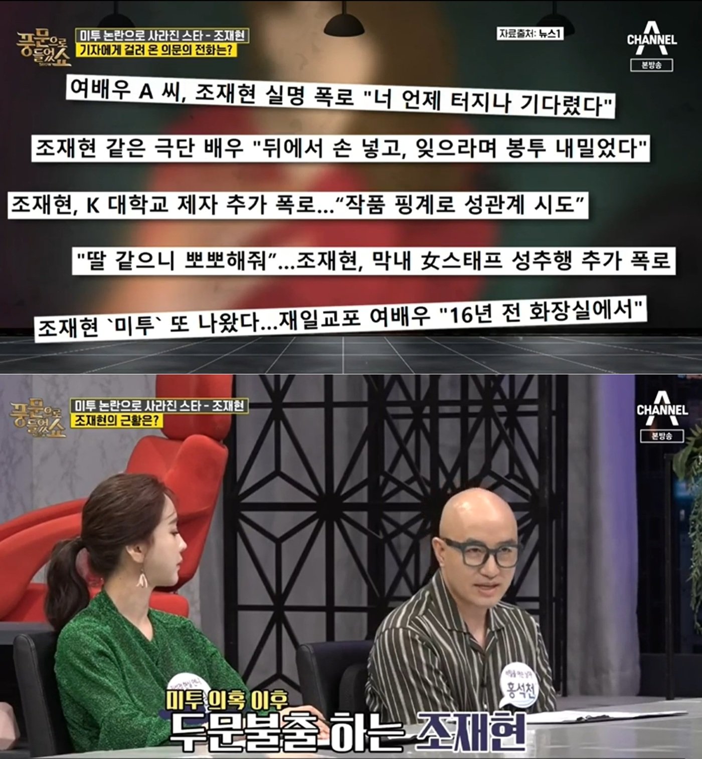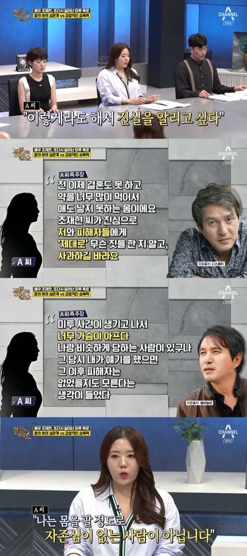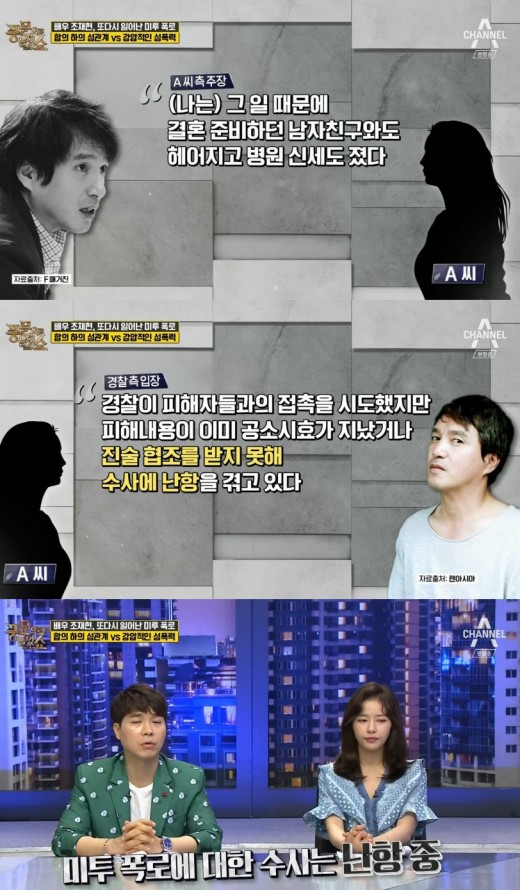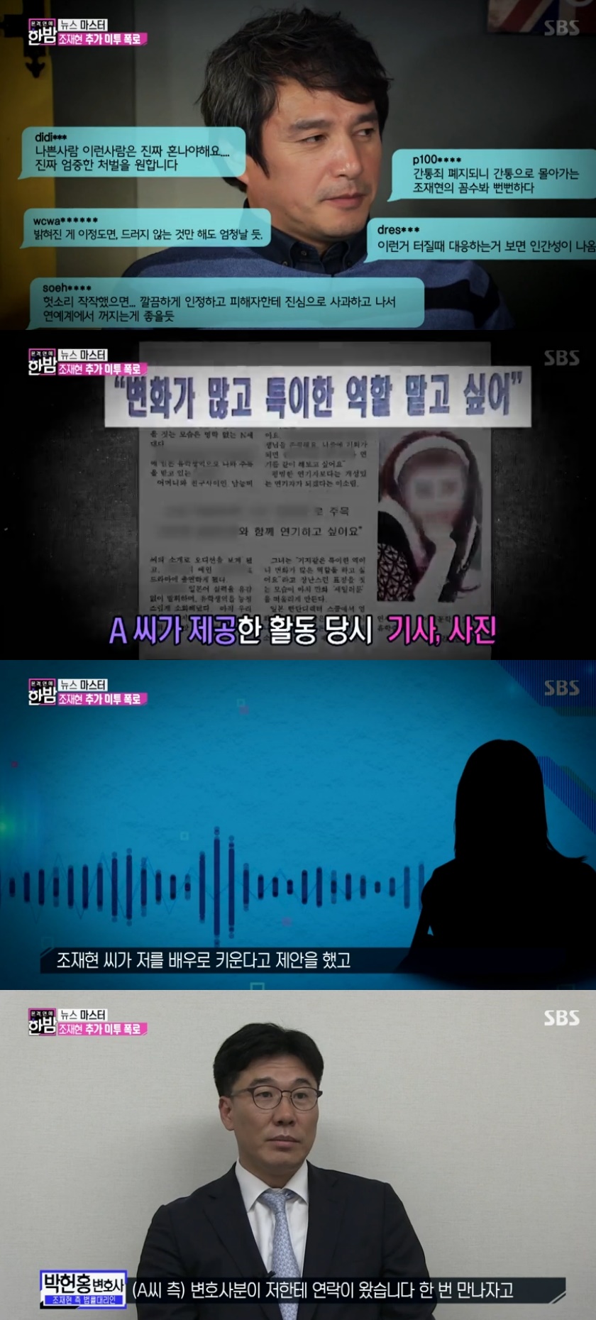 또한 조재현에게 진로상담을 요청했다가 성추행을 당했다고 주장하는 사람의 폭로도 나왔습니다. 2011년 경성대 학생이던 A 씨는 "학교 선배인 조재현이 호텔로 데려가 성관계를 시도했다"며 "옆에 앉혀서 키스를 하더라. 옷도 벗기려고 했다"고 폭로했습니다.