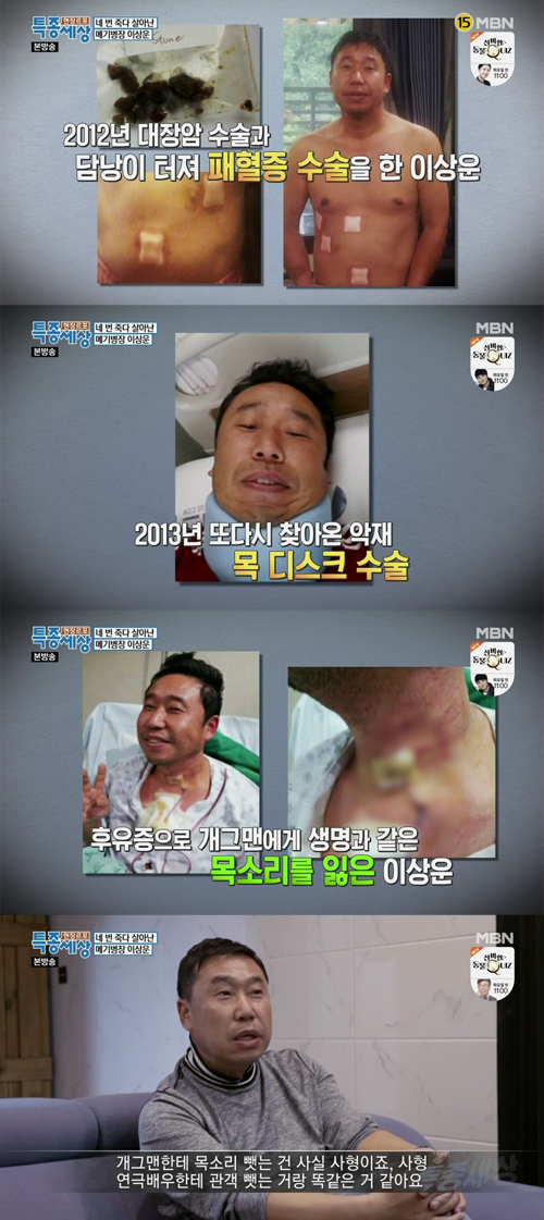 이상운은 2012년 대장암 수술과 담낭이 터져서 패혈증 수술까지 했다고 하는데요, 2013년에는 마비 증상이 나타나 목 디스크 수술을 했으나 후유증으로 목소리를 잃었었다고 합니다.
