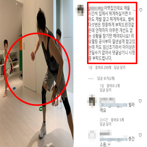 A 씨는 11일 이휘재 부인인 문정원의 인스타그램 게시물에 "아랫집인데요. 애들 몇 시간씩 집에서 뛰게 하실 거면 매트라도 제발 깔고 뛰게 하세요"라며 "벌써 다섯 번은 정중하게 부탁드린 것 같은데 언제까지 아무런 개선도 없는 상황을 참기만 해야 할까요?"라고 덧붙였습니다.