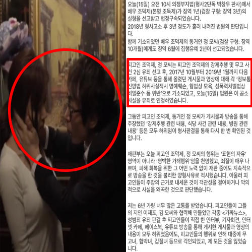 재판부는 "피고인 조 씨는 독단적인 추측으로 허위사실을 적시했다"며 "강제추행 실제 장면과 다른 영상을 제작·게시해 피해자가 허위 진술을 한 것으로 보이게 했다"고 밝혔습니다.
