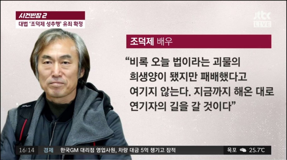여배우를 성추행한 혐의로 유죄가 확정된 배우 조덕제가 이번에는 해당 여배우의 명예를 훼손하는 글을 인터넷에 올린 혐의 등으로 실형을 선고받았습니다.