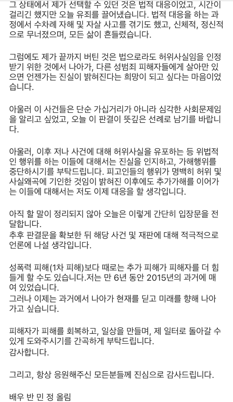 반민정은 공식 입장문을 내고 심경을 전달했는데요, 반민정은 "저는 6년가량 너무 많은 고통을 받았다"며 "피고인들의 행위로 인해 대중에 무고녀, 협박녀, 갑질녀 등으로 각인되었고, 제 모든 것을 잃었다"고 말했습니다.