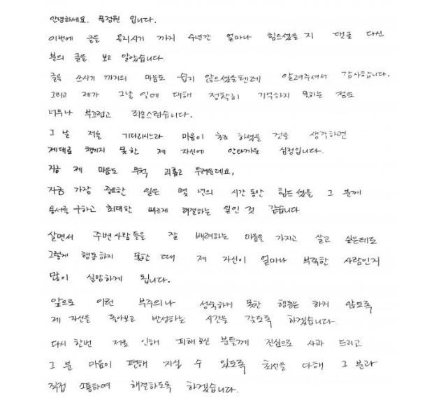 문정원은 자필 편지를 통해 사과했습니다. 문정원은 에버랜드 장난감 먹튀 논란에 대해 "글을 쓰시기까지의 마음도 쉽지 않으셨을 텐데 알려주셔서 감사하다"면서 "글을 올리시기까지 수년간 얼마나 힘드셨을지, 댓글 다신 분의 글을 보고 알았다"고 밝혔습니다.