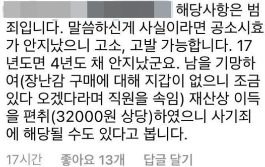 당시 장난감 판매 직원으로 일했다는 글쓴이는 문정원이 '나중에 돈을 주겠다'라고 했는데 폐점시간까지 기다려도 오지 않았고 결국 자신이 물건값을 채워 넣어야 했다고 주장했습니다. 그러면서 "당시 문정원이 아들과 직접 찍어준 사진이 있었는데, 그게 결국 유료였나 보다"라고 꼬집었습니다.