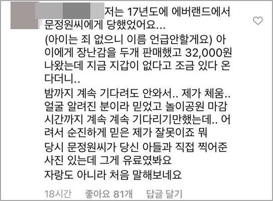 당시 장난감 판매 직원으로 일했다는 글쓴이는 문정원이 '나중에 돈을 주겠다'라고 했는데 폐점시간까지 기다려도 오지 않았고 결국 자신이 물건값을 채워 넣어야 했다고 주장했습니다. 그러면서 "당시 문정원이 아들과 직접 찍어준 사진이 있었는데, 그게 결국 유료였나 보다"라고 꼬집었습니다.